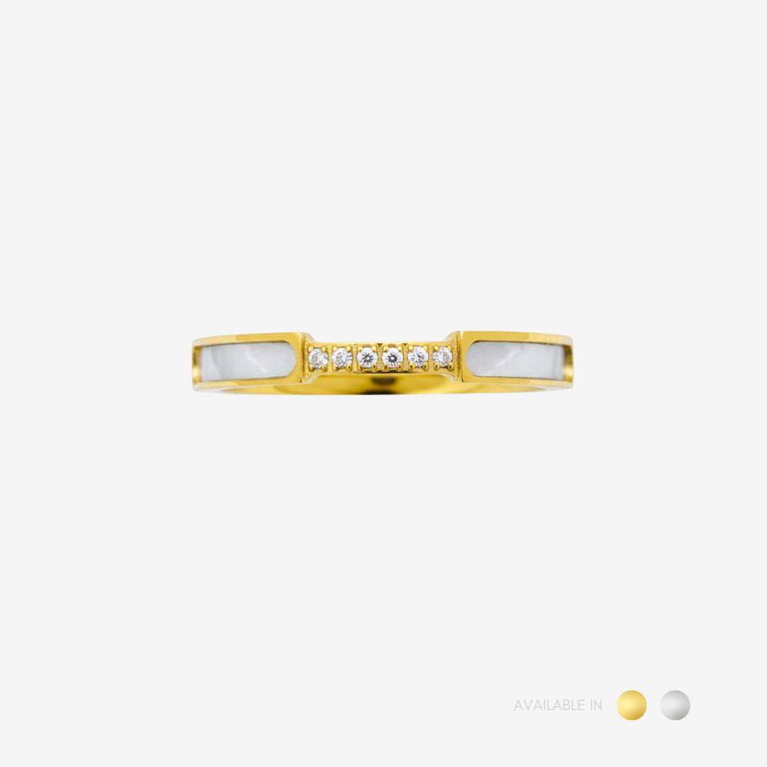 Sophisticated and luminous, the Cassandra Titanium Ring is crafted with sleek inlaid panels and a row of delicate sparkling stones set gracefully at the center. Its clean lines and balanced silhouette create a modern yet timeless aesthetic, offering subtle brilliance that complements both everyday styling and elevated occasions.