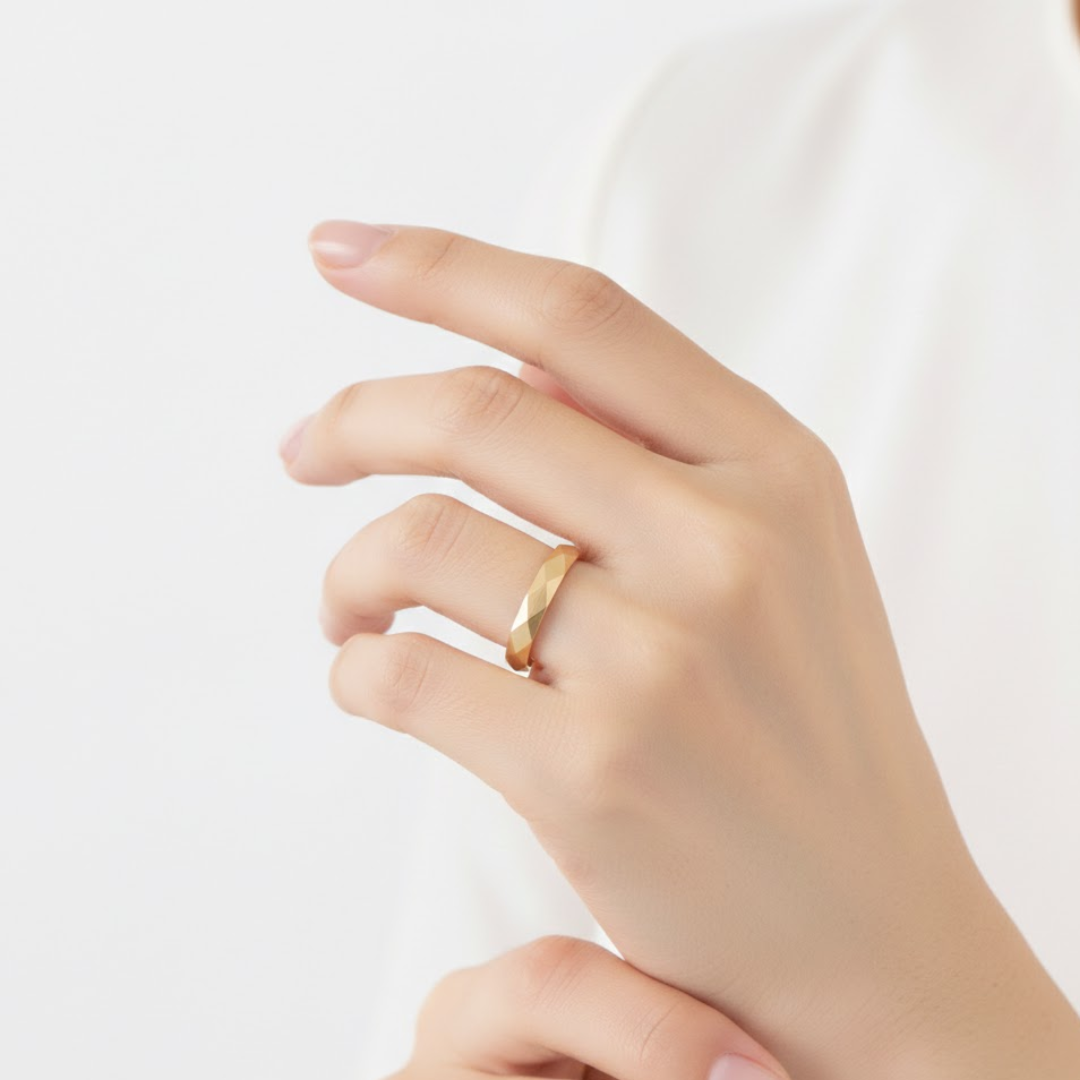 Clean and contemporary, the Oris Titanium Ring features a faceted geometric band that reflects light with subtle dimension. Its structured silhouette and polished gold finish create a bold yet minimalist statement, making it a versatile essential for everyday wear. Modern in design and timeless in appeal, Oris embodies effortless confidence and refined simplicity.